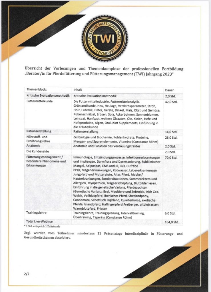 Im Herbst 2025 habe ich die 2,5jährige berufsbegleitende Fortbildung zur Beraterin für Pferdefütterung und Fütterungsmanagement bei Conny Röhm am Tierwissenschaftlichen Institut (TWI) abgeschlossen. Hier ein Blick in den Lehrplan: